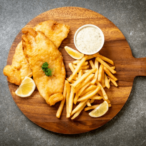 Sole dipped in egg batter sauteed in a lemon white wine sauce