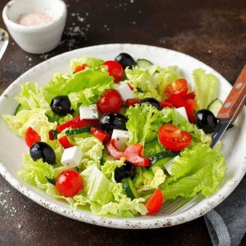 Fresh mix greens with peppers, onions, cucumbers, tomatoes, grape leaves, pepperoncini, olives, feta cheese